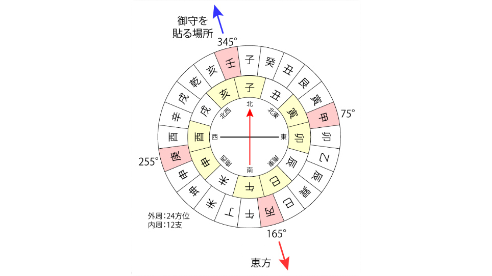 そのため、御守りを貼る場所は、恵⽅の反対側の北からやや西(北微西)の壬(みずのえ)⽅位⾓345度です。