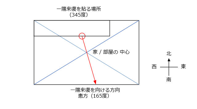 家の中心点もしくは普段居る部屋の中心点を割り出し、中心から見て、北側の方位角345度の高い所に貼ります。御守は南側の恵方の⽅位⾓165度に向けて貼ってください。以下の図を参考にして下さい。