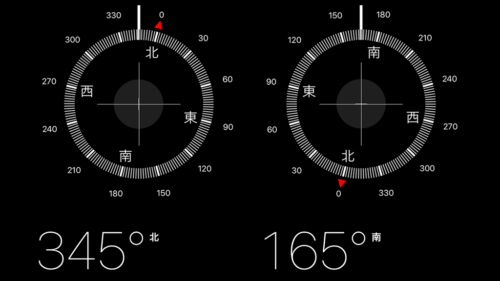 スマートフォンの磁気センサーは誤差を持っていることがあるので、コンパスアプリを使う時は事前に8の字キャリブレーション(スマートフォンを持って、8の字を2~3回描く)してから使いましょう。