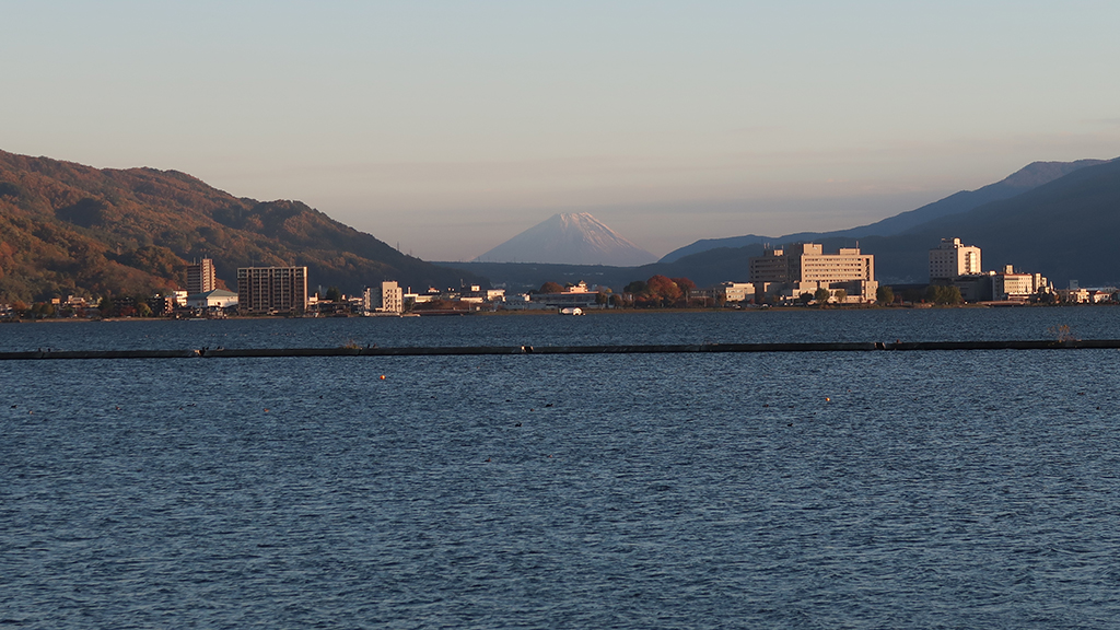 諏訪大社に参拝した時に、「この天気なら諏訪湖から富士山が見えるのでは?」と思って、いつものポイントに行ってみました。