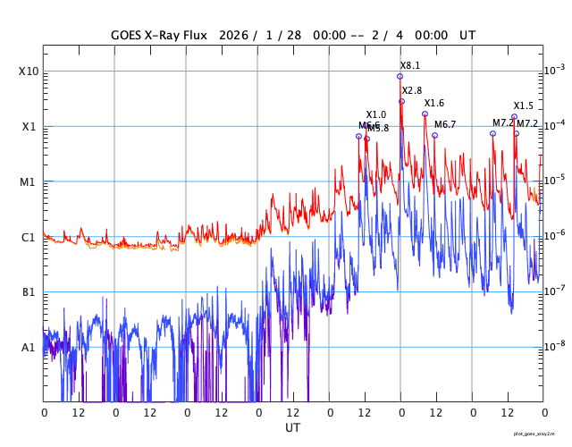 X1.0の太陽フレアの前後にはM(中規模)クラスの太陽フレアが頻発し、その後にX8.1、X1.5、X2.8、X1.6、X1.5の大規模太陽フレアが連続して発生。