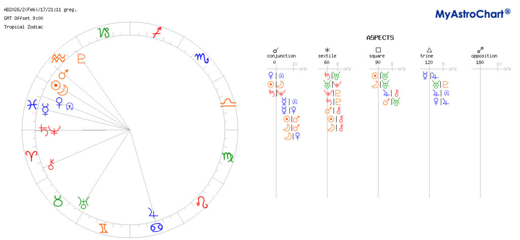太陽と月は、自分自身の顕在的要素と潜在的要素。海王星と土星は、無意識と意識。となり、人間が持っている二つの側面である、意識と無意識が合となる配置になります。