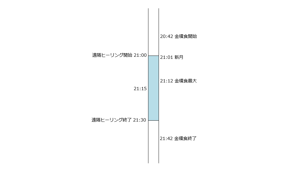 遠隔ヒーリングの始まる18分前から金環食が始まり、遠隔ヒーリング最中の21:12に金環食が最大となります。