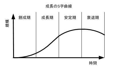 成長のS字曲線と呼ばれる、創世期から衰退期までを表した図があります。